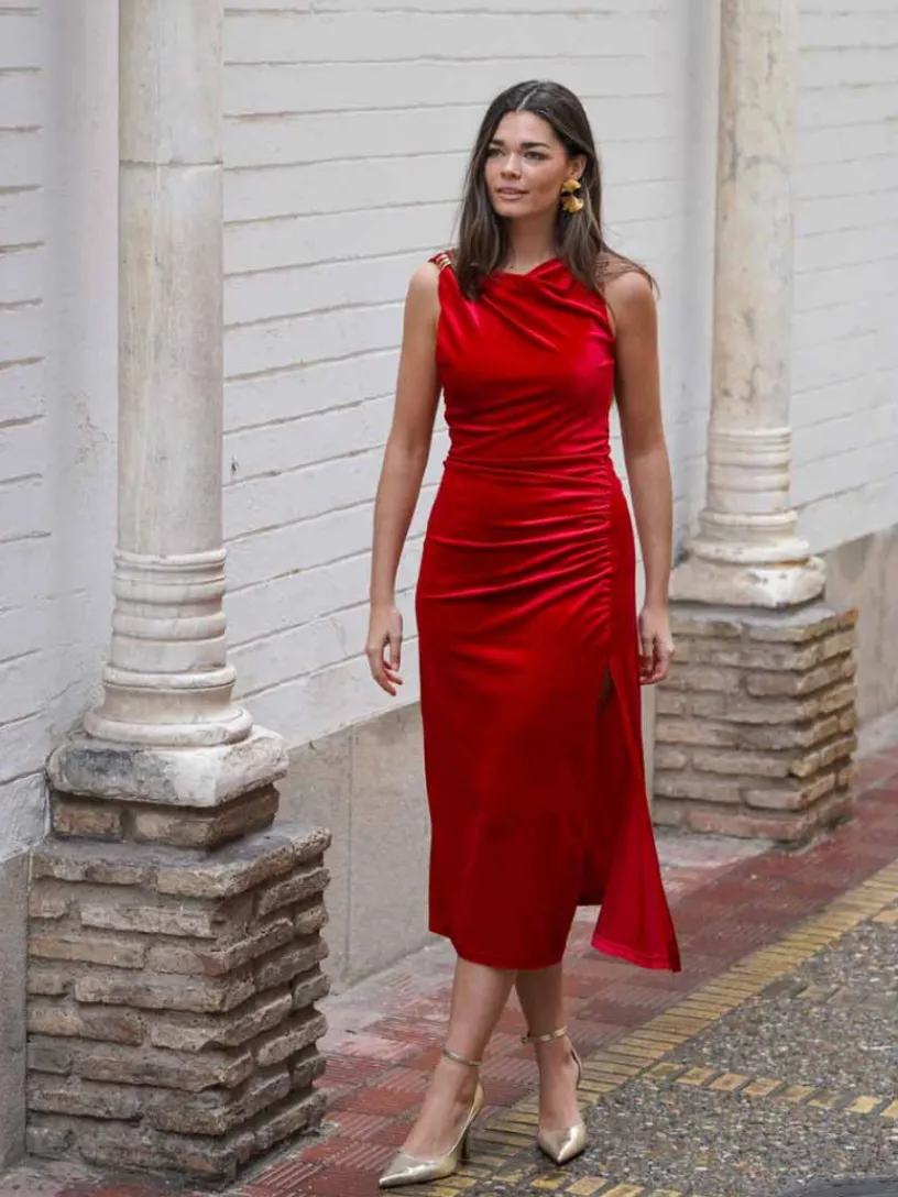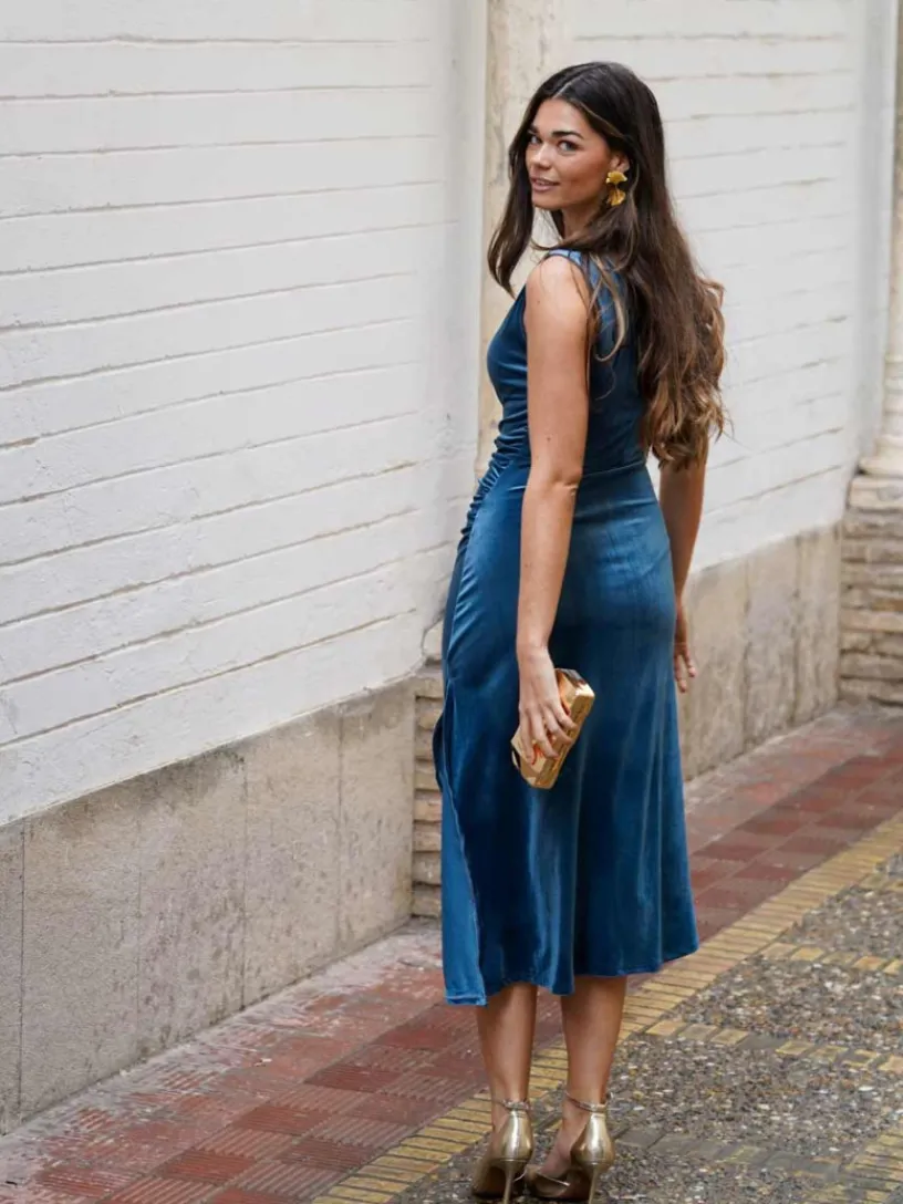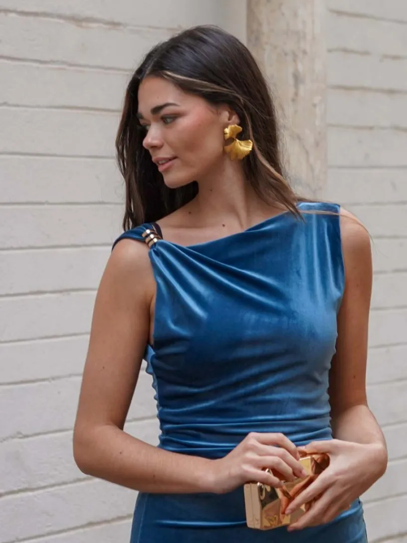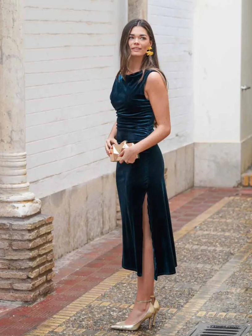 Su diseño incluye un detalle fruncido en el lateral que estiliza visualmente la silueta y añade movimiento, mientras que el aplique dorado en el hombro aporta un punto de luz que eleva el look. El escote cerrado y las mangas largas lo hacen perfecto para ocasiones formales o celebraciones nocturnas durante los meses más frescos.