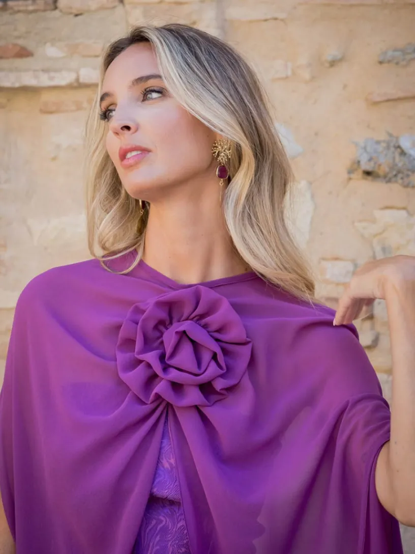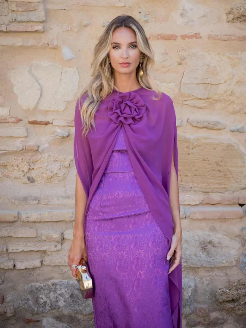 Nuestro vestido de invitada se complementa con una capa de gasa, diseñada para ofrecer mayor comodidad gracias a sus aberturas a la altura de los brazos. Como toque final, una flor adorna la parte superior delantera de la capa.