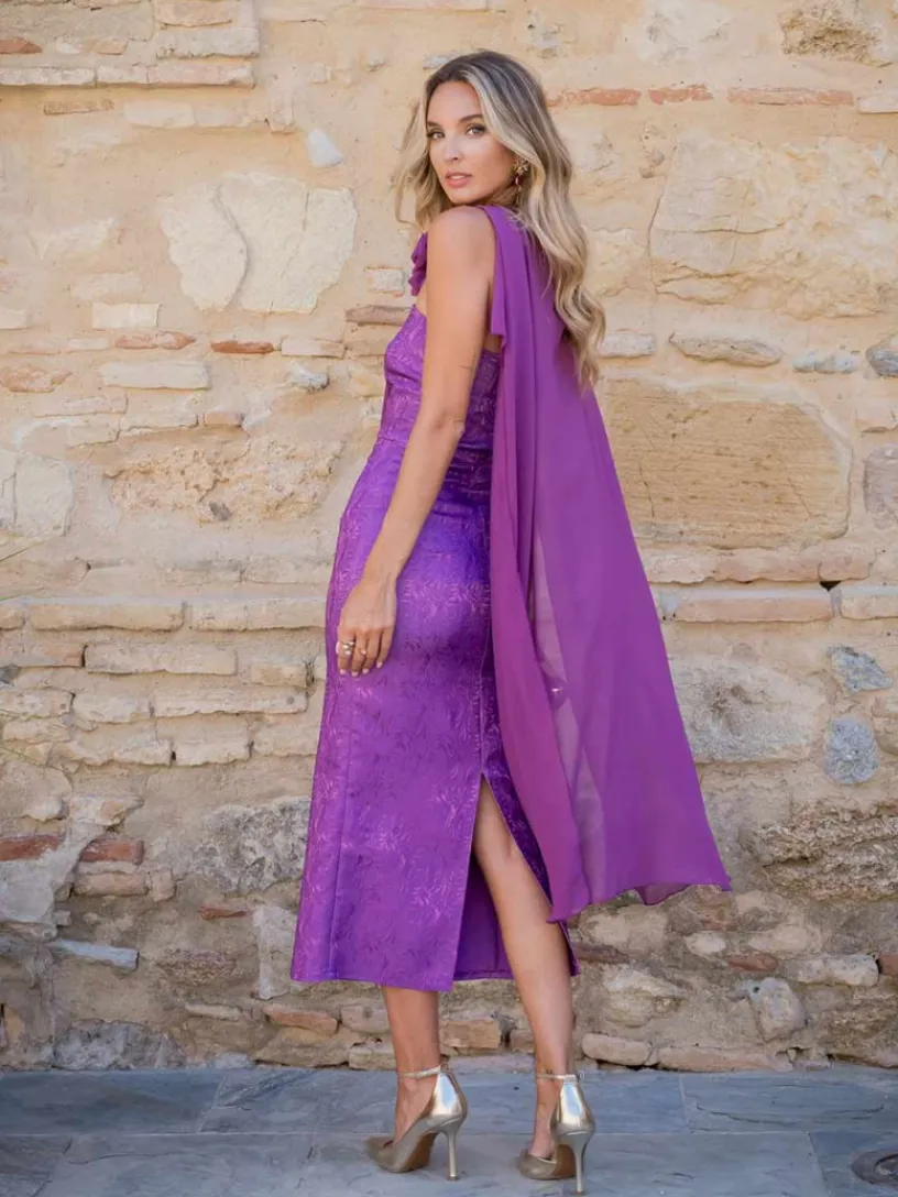 Vestido Amatista, un diseño exclusivo de nuestra colección Alborada. Vestido midi de línea recta con el que marcar tu figura con sutileza, incorporando una abertura en el bajo que facilita el movimiento al caminar.