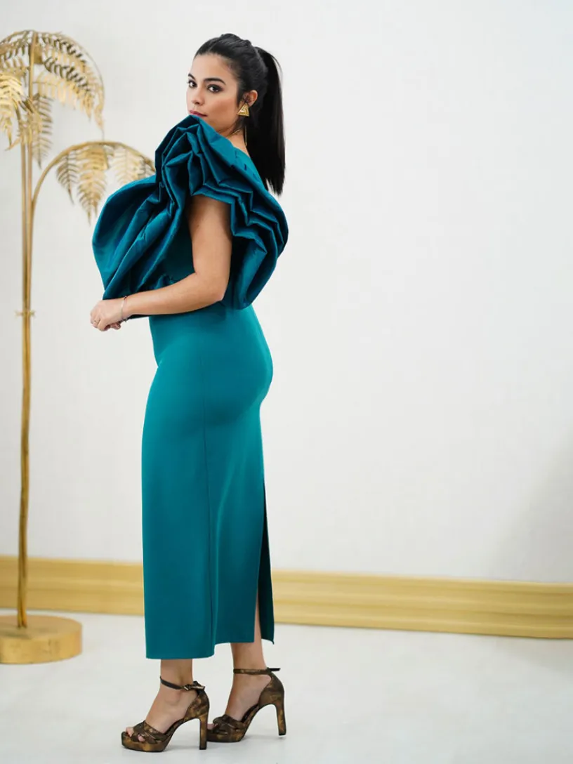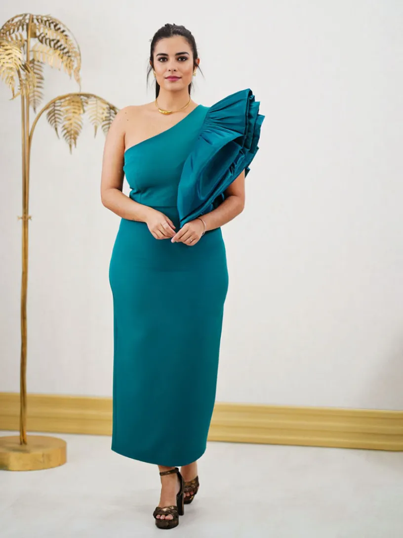 Es un vestido asimétrico que deja el hombro derecho al descubierto, mostrando un toque sutil de sensualidad mientras que el hombro izquierdo cuenta con llamativos volantes que acentúan tu silueta y añaden un toque de elegancia y estilo.