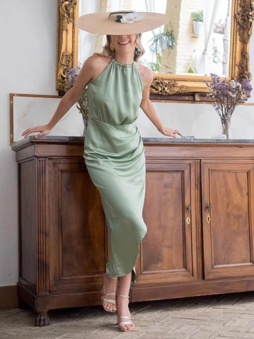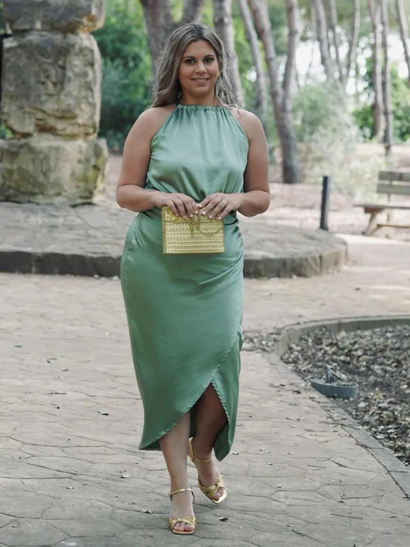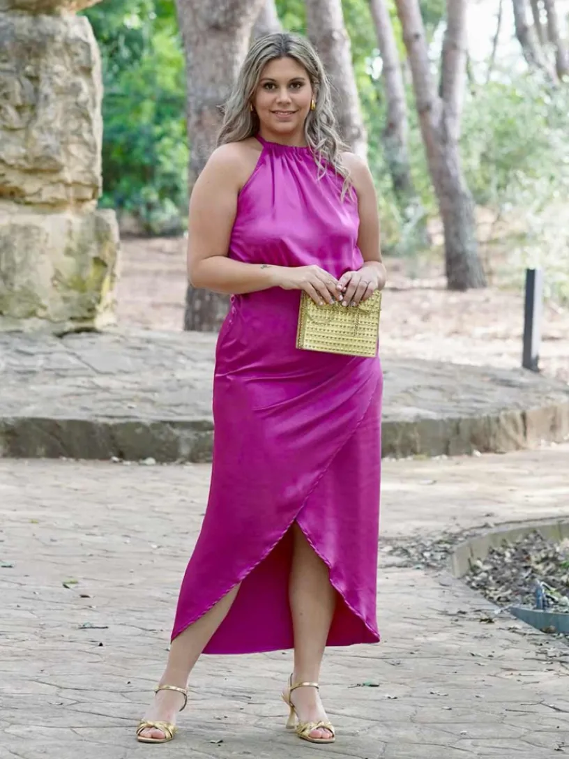 Su diseño midi lleva una abertura delantera que crea el efecto tulipán en la falda, aportando un toque chic. Escote tipo halter cerrado con una lazada en la parte trasera del cuello, aportando aire de elegancia.