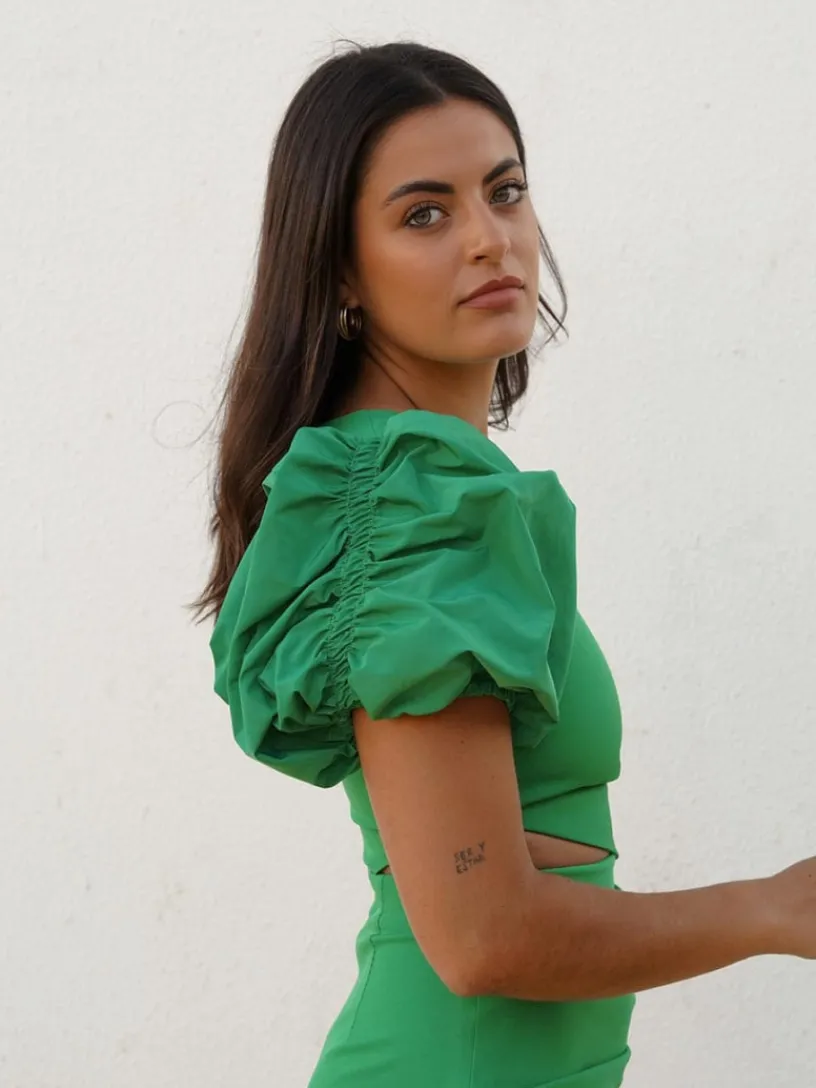 Este vestido midi de fiesta combina dos tipos de tejido: politecno que contribuye a estilizar la silueta y vinilo en la zona de las mangas abullonadas. Para mayor comodidad incluye una apertura en el lado izquierdo y contiene forro interior. Además, tiene cremallera para asegurar el cierre total y la comodidad.