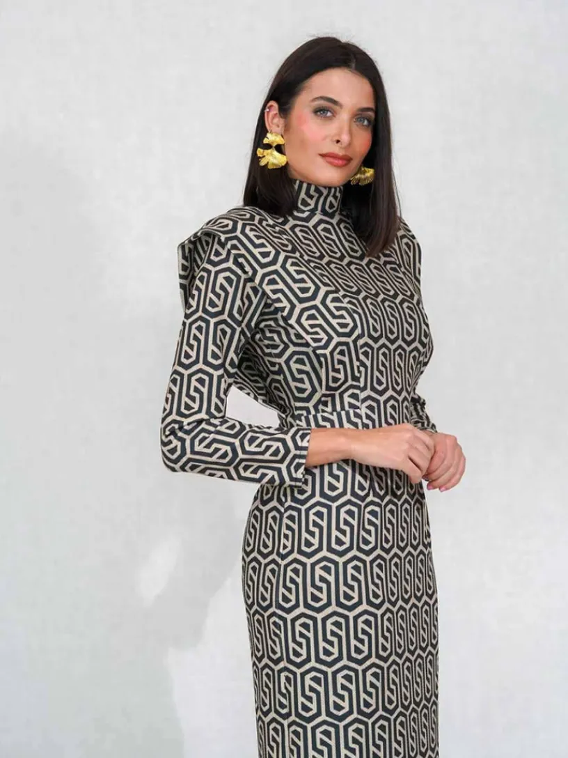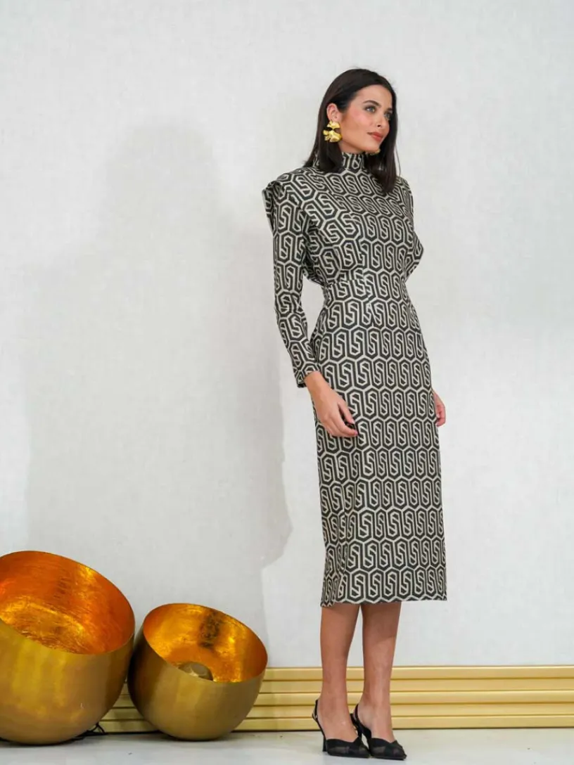 Nuestro vestido midi de fiesta está confeccionado en tejido grueso con elastano, lo que garantiza una adaptación perfecta a cualquier figura. Su estampado de formas geométricas verdes sobre fondo beige añade un toque original.