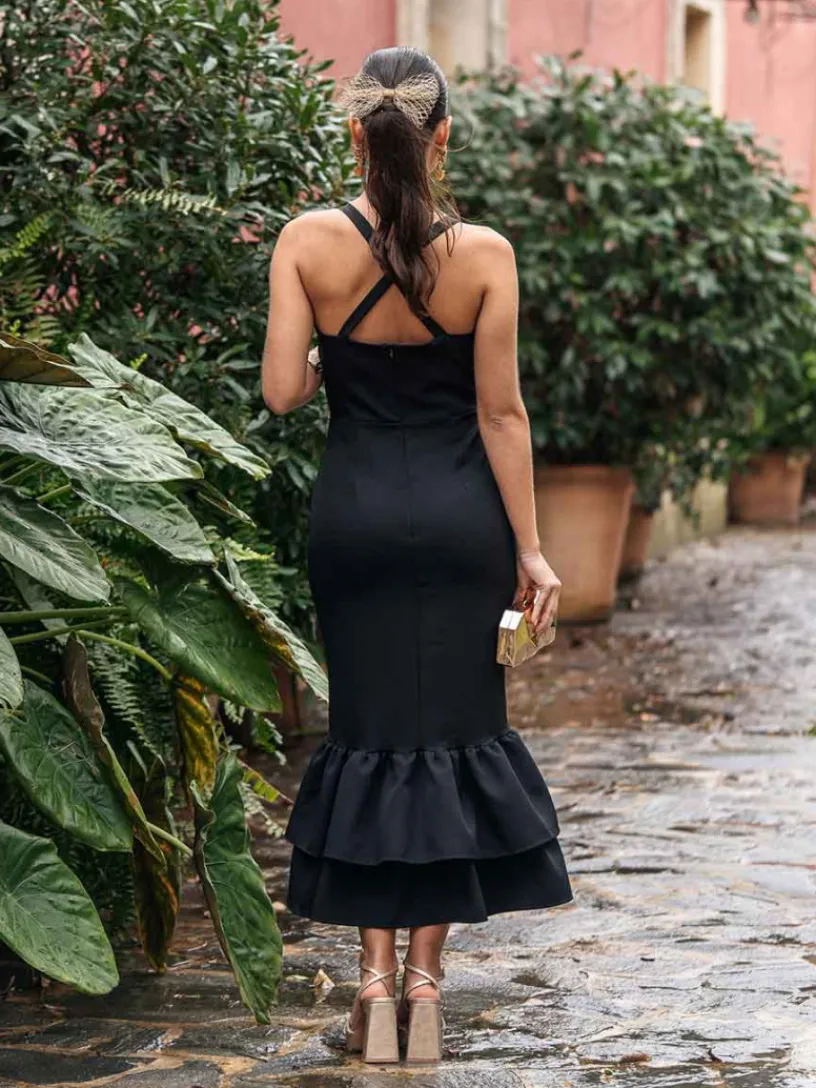 Este vestido de corte midi y silueta de línea recta lleva dos volantes en el bajo, añadiendo un toque de movimiento y originalidad. Confeccionado en un tejido de politecno, ofrece la ventaja de no necesitar forro interior debido a su opacidad. Y, gracias al elastano del tejido,garantiza que se ajuste cómodamente a tu figura, realzando tus curvas con elegancia.