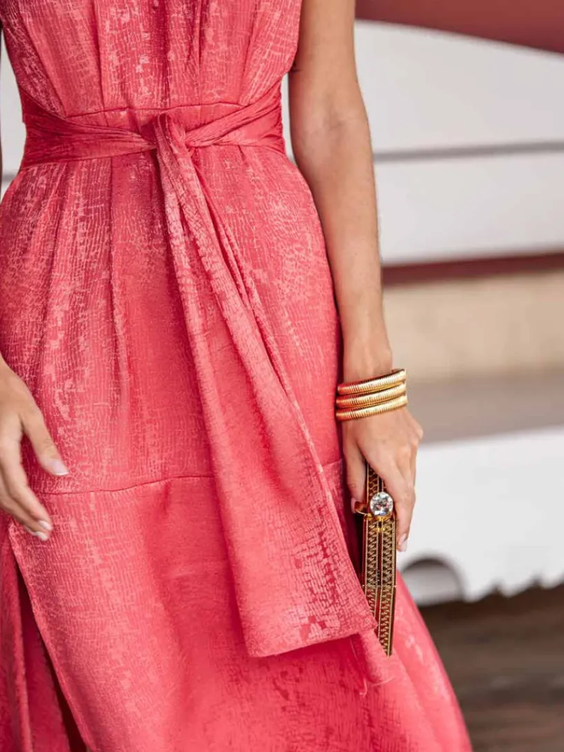 Vestido Catalina Geranio. Con escote V, este vestido acentúa la silueta de manera sutil. La lazada en la cintura te permite ajustar el vestido a tu gusto, ofreciendo un toque extra de estilo. Manga a la sisa con hombreras. Contiene una cremallera trasera invisible que asegura un mejor ajuste.
