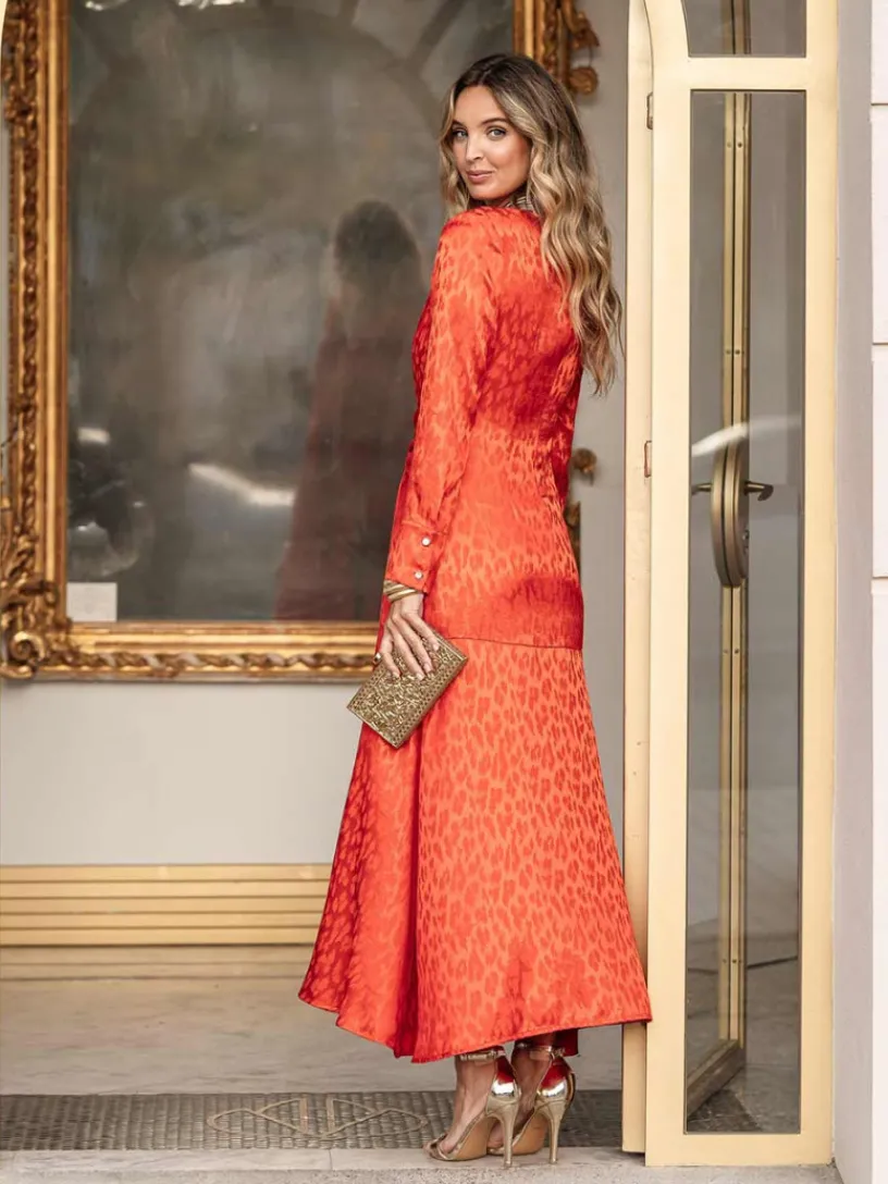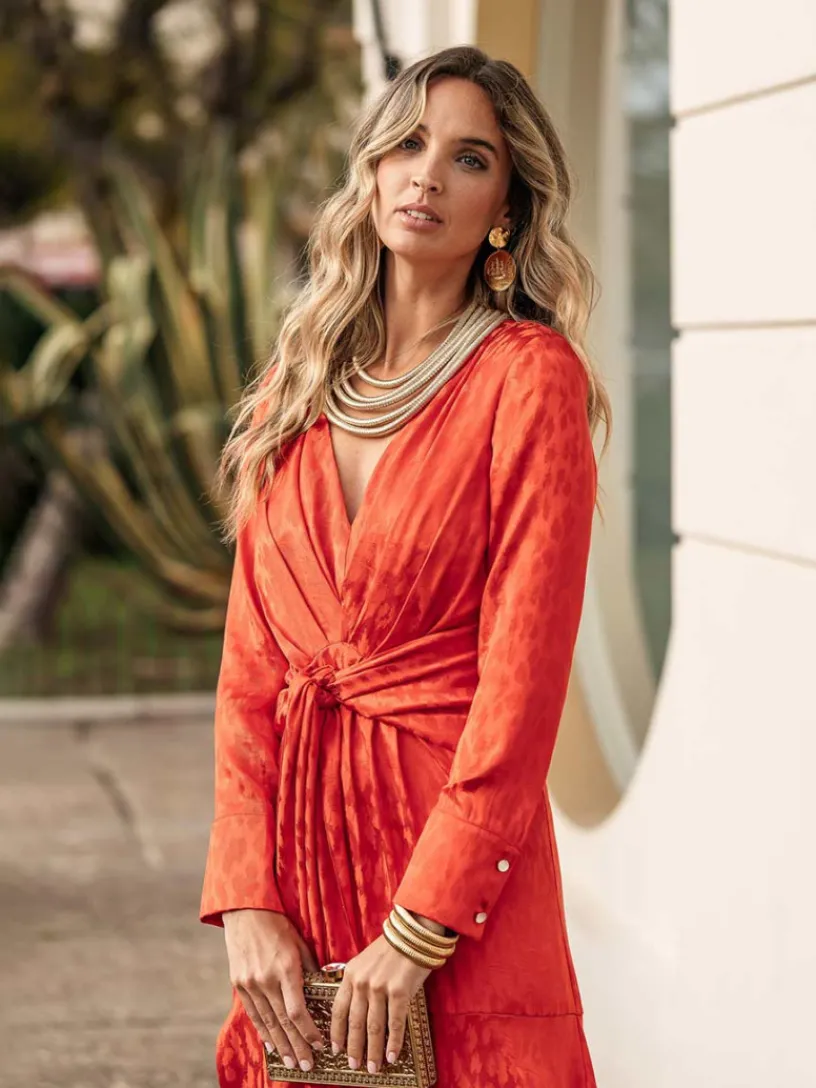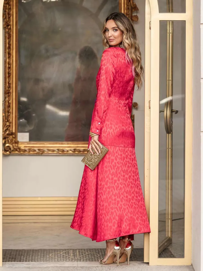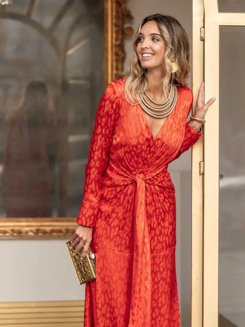 Vestido Luna Gadir, gracias a su diseño midi-largo lo convierte en una opción perfecta para diversas ocasiones, ideal para eventos tanto de día como de noche como bodas, bautizos, comuniones etc. Confeccionado en tejido satinado que destaca por su sutil estampado animal print. Su escote en forma de V es un clásico que siempre sienta bien y en la cintura lleva una lazada que podrás ajustar como más te guste.