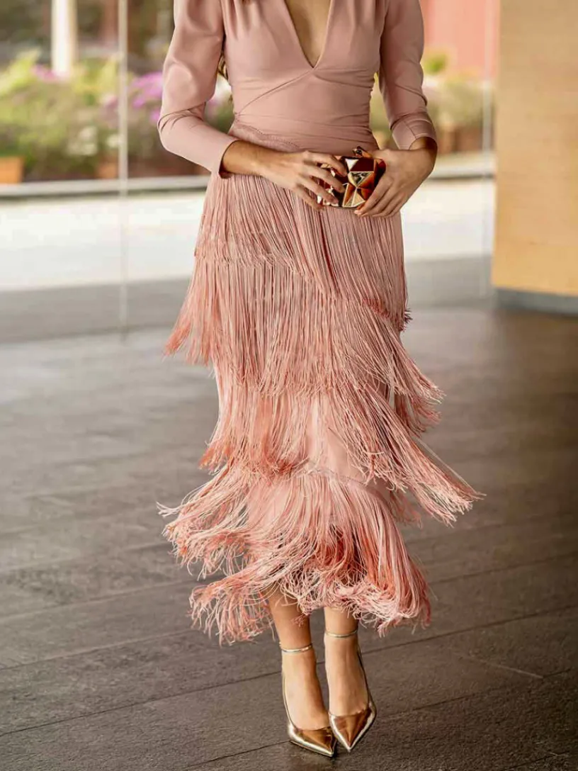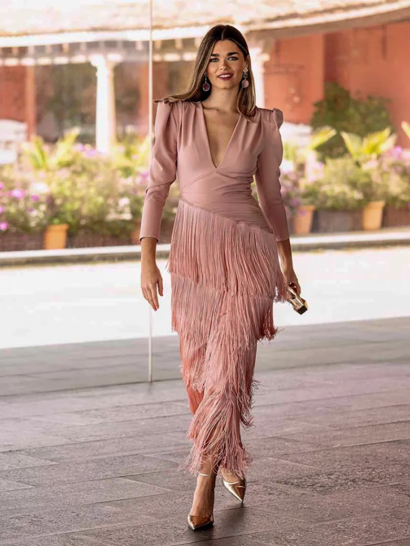 Vestido Flecos Palmito, un vestido largo de flecos que te hará ser una invitada perfecta en tus eventos esta temporada.